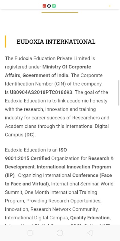 Eudoxia Education Private Limited在印度政府公司事務部註冊。公司的公司標識號(CIN)為U80904AS2018PTC018693。 Eudoxia教育的目標是通過這個國際數字校園(DC)將學術誠信與研究,創新和培訓行業聯繫起來,以確保研究人員和院士的職業成功。