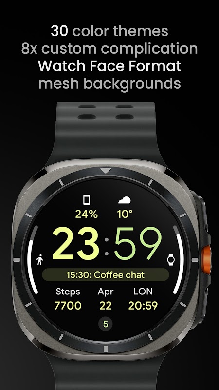 探索 30 多種顏色主題來搭配您的心情或服裝。真正的黑色背景確保清晰度和電池效率。高解析度視覺效果在任何智慧手錶上都熠熠生輝。