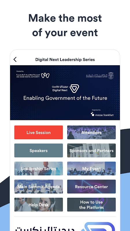 通過該應用程序,您可以訪問 2021 年全年舉辦的 Digital Next Leadership 系列以及 2022 年 2 月 22 日至 23 日在阿布扎比阿提哈德競技場舉行的主要 Digital Next 峰會。