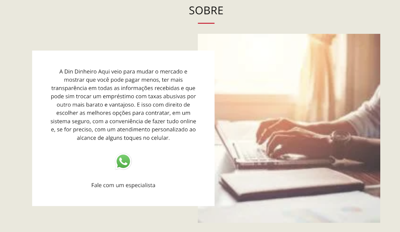 A Din Dinheiro Aqui veio para mudar o mercado e mostrar que você pode pagar menos, ter mais transparência em todas as informações recebidas e que pode sim trocar um empréstimo com taxas abusivas por outro mais barato e vantajoso. E isso com direito de escolher as melhores opções para contratar, em um sistema seguro, com a conveniência de fazer tudo online e, se for preciso, com um atendimento personalizado ao alcance de alguns toques no celular.