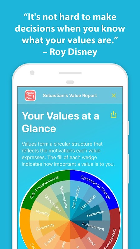 This app is based on the “Theory of Basic Human Values” by S. H. Schwartz. Schwartz’s research was validated in hundreds of studies and plenty of peer-review.