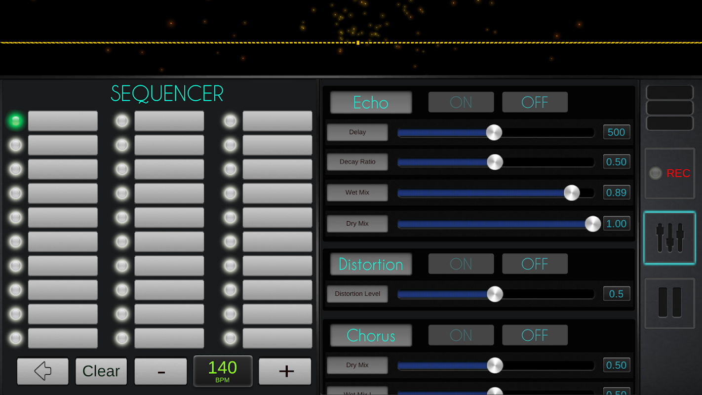 In DubStep Song Maker, we provide great sound filters and FX to make your music even better. We have Echo, Low pass, High pass, Reverb, Distortion, Chorus, and Pitch.