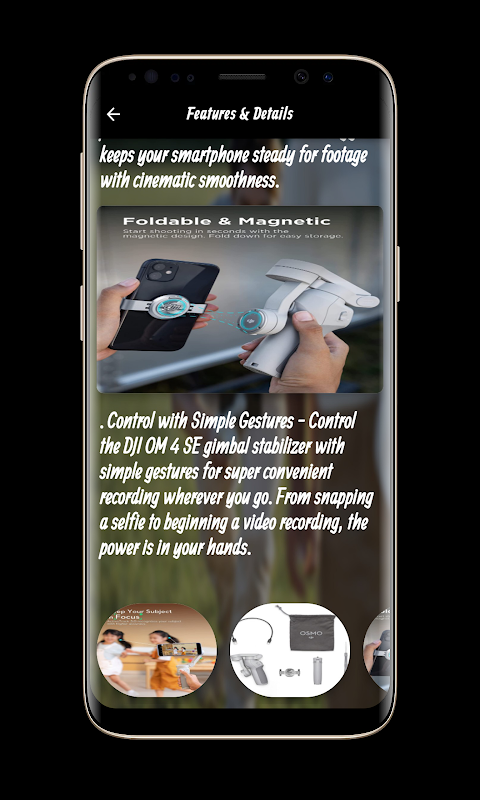 DJI OM 4 SE 指南應用程序包含 DJI OM 4 SE 的許多信息和功能,您可以清楚、輕鬆地獲得。通過 DJI OM 4 SE 指南應用程序,您可以觀看 DJI OM 4 SE 的視頻,從而可以查看 DJI OM 4 SE 指南的外觀和它的許多不同的功能,包括感受阻力 - 立即連接您的智能手機DJI OM 4 SE 雲台穩定器,隨時隨地享受完美攝影。智能手機雲台採用磁吸式設計,可快速輕鬆地固定手機,讓您在靈感迸發時拍攝出流暢、富有創意的照片。