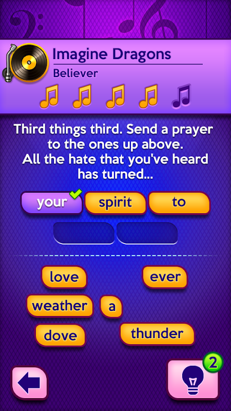 聆聽 2018 年最新發行的 160 多首流行歌曲和過去幾首熱門歌曲,並嘗試猜測藝術家、歌曲名稱或歌詞如何繼續。您將聆聽一首歌曲的一部分以及屏幕上的歌詞,然後您必須選擇正確的答案。
