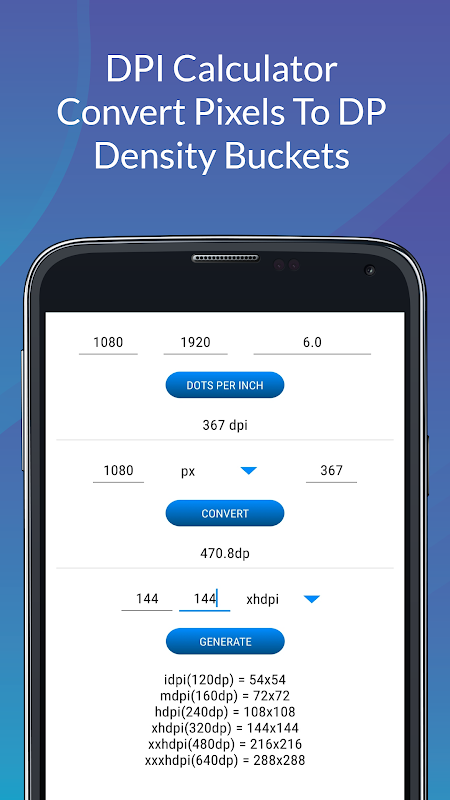 以您手機的每英寸像素數設計用戶界面,使您的應用程序完美適合您的手機。 Android 設備的寬高比有 3:2、4:3、8:5、5:3、16:9 等等。可繪製桶分為 idpi、mdpi、hdpi、xhdpi、xxhdpi 屏幕密度。從 300 多台設備中進行選擇。了解設備的像素密度將使佈局設計變得容易。 Dpi轉換是一個非常可靠的工具,它與官方android頁面中提到的文檔一致。