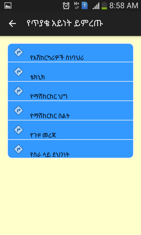 This App is used to train new drivers for theory exam in Ethiopia and also helps to refresh drivers about their knowledge of the driving rules of Ethiopia.