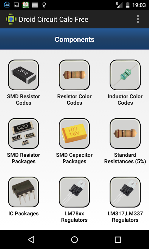 Droid Circuit Calc 提供電子電路計算器、電子元件指南、有用的電子資源指南、為愛好者提供的大量電子電路、電子符號和 74xx IC 系列引腳排列等。