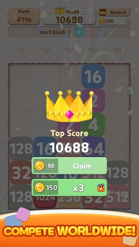 你加總的方塊數字越高,獲得的分數就越多。分數越高,排名越高!