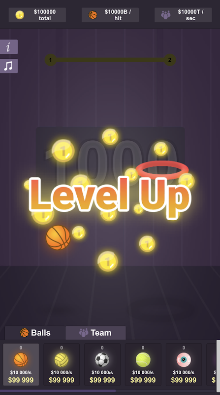 Shoot hoops to earn coins, buy and upgrade balls to earn more per each hit, hire team to make passive income. Gain score to achieve new levels. Every clean dunk multiplies your hit score. Each level up multiplies your balance.