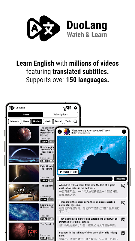 DuoLang:Watch & Learn 是您的首選雙字幕播放器,旨在讓語言學習既有趣又有效。透過您喜愛的類別中引人入勝的影片來提升您的聽力、口語和詞彙技能。