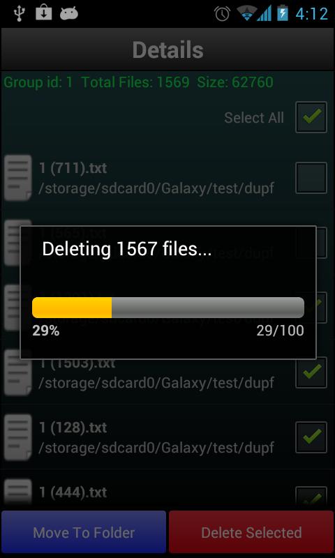 In Results screen, press any button to go to the Details screen where files are listed. Select the check boxes corresponding to the files you want to delete. By pressing the "Delete Selected" button you can delete the files you have selected.