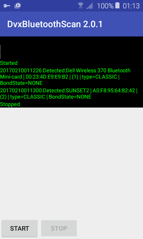 Cet outil permet de rechercher tous les périphériques Bluetooth à proximité. Le scan est effectué en boucle, et cela est idéal pour par exemple rechercher tous les périphériques Bluetooth en parcourant une certaine distance (dans tout un bâtiment par exemple, ou en se déplaçant).