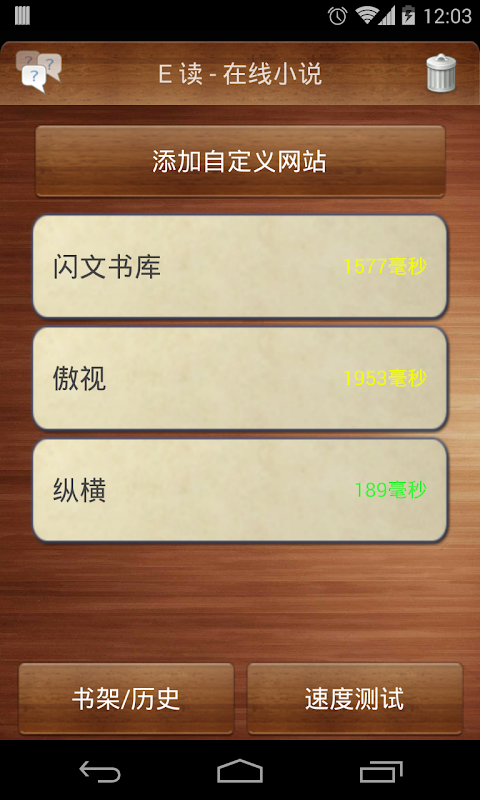支持添加书架,阅读历史,书籍目录,网站测速,夜间模式,目前不支持离线阅读。