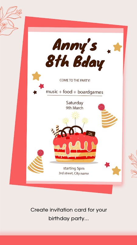 Free birthday invitation E-card maker with picture name application allows you to invite your friends and family to your unique events via HD greeting card maker. It is just one of the best conserve the day birthday card manufacturer and easy to use applications to create send tailor invite on the go. It will certainly let you make invitations cards, flyers, and also posters as well. By utilizing this invitation manufacturer free, you will require not to have any kind of making abilities.