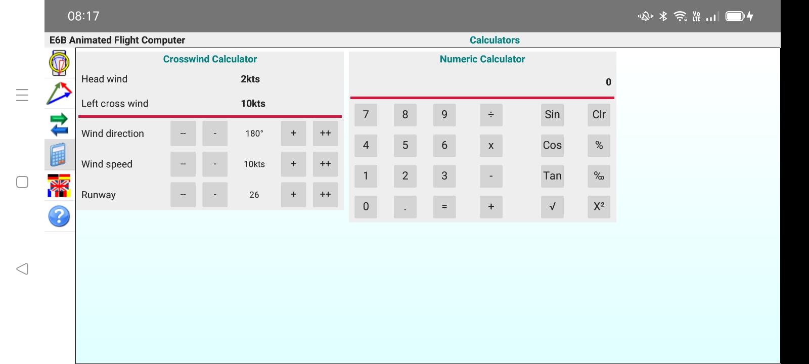 - 內建小型計算器,可協助您確定例如 EET(等效全速飛行時間),另一個計算器可計算側風、頂風和順風。
