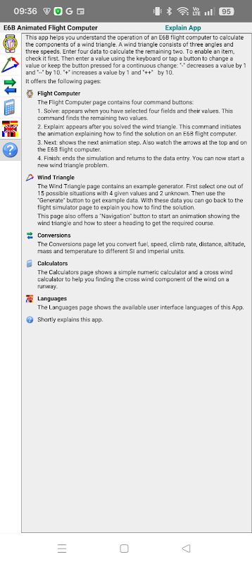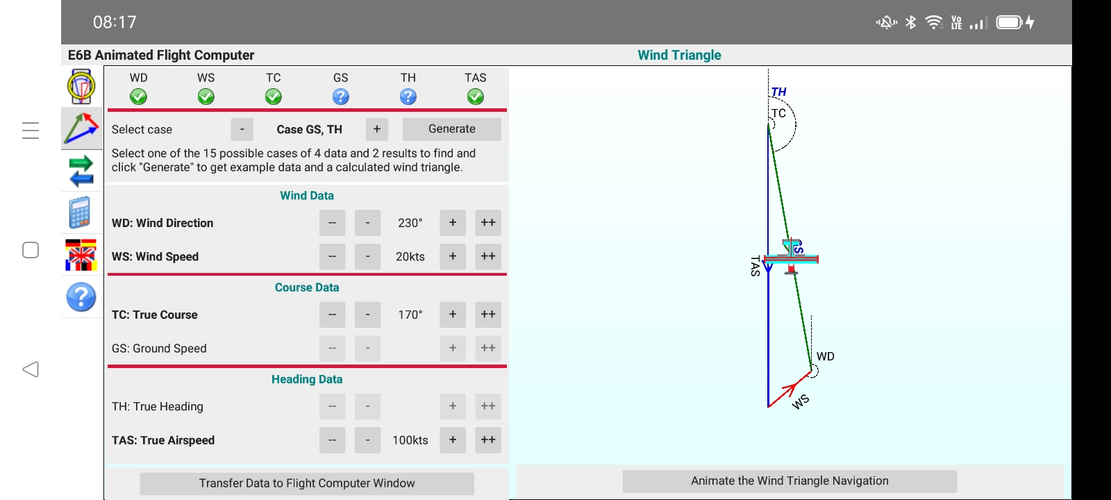 這款應用程式透過讓您輸入六個值中的四個(三個速度和三個角度)來求解風三角形,並計算剩餘的兩個值。然後,它會逐步解釋如何透過動畫飛行電腦獲得解決方案,示範每個步驟的操作:動畫會旋轉圓盤、滑動圓盤並添加標記。它還會顯示每個步驟中應該使用哪個給定值來求解。