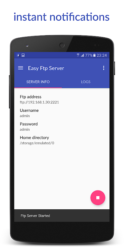 為您的手機方便,快捷,實用的FTP服務器。您可以運行只需點擊一下鼠標或自定義設置。客戶端連接FTP服務器信息顯示在主屏幕上。