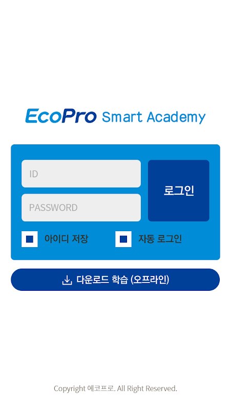 PC환경의 EcoPro 스마트 아카데미(http://ecopro.hunet.co.kr)의 아이디와 비밀번호 로그인 가능하며, 사이트에서 진행되는 과정검색 및 수강신청, 나의강의실 등 주요 서비스를 본 모바일 앱에서도 사용하실 수 있습니다.