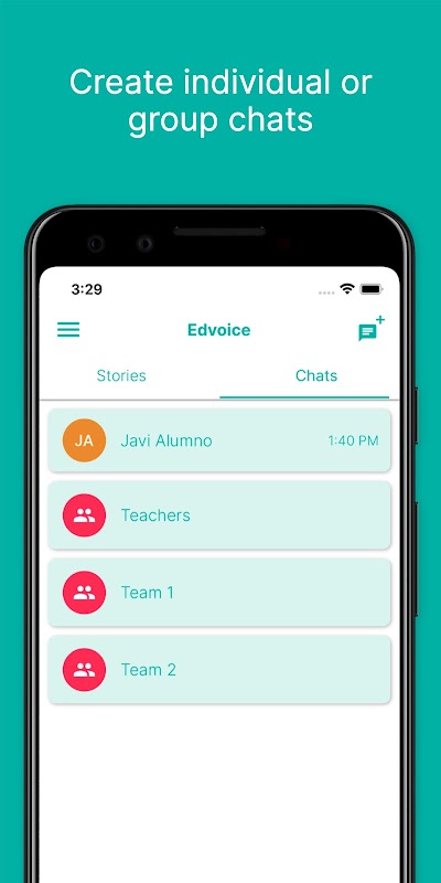 除了接收一系列通知的故事之外,該應用程式還具有聊天和群組功能。與故事不同,它們提供雙向訊息傳遞,這使得它們非常適合小組合作並促進與學生和家庭的訊息交流。