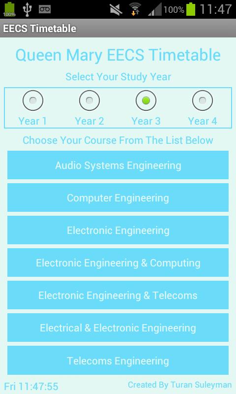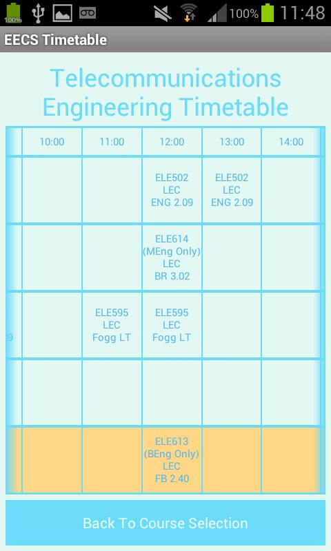 Timetable App For Queen Mary EECS Engineering Courses. Choose Year And Course To View Tailor Made Timetable For Each Individual Course. Features Include Horizontal Scrolling And The Emphasise Of The Current Day Via An Orange Highlight.