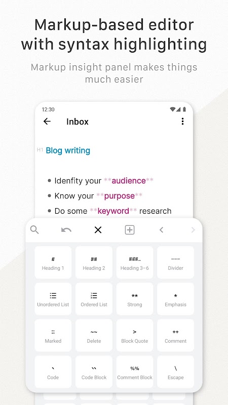 + 簡化的標記語言讓您無需將手指從鍵盤上移開即可完成寫作。