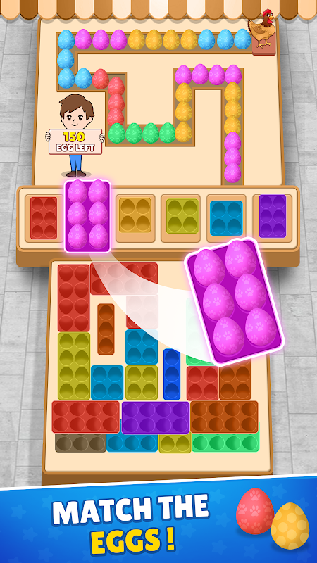 「雞蛋分類大師」是一款有趣且令人上癮的益智遊戲,挑戰您將彩色雞蛋分類到正確的蛋盤中。遊戲測試邏輯、解決問題的能力和戰略規劃,玩家需要在有限的插槽中按顏色組織雞蛋。