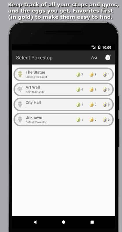 Use Egg Tracker to register what kind of eggs you receive and where you got them, as well as what they hatched into. Egg Tracker provides you with numerous statistics to show you which stops gave you the most purple eggs, how many eggs you received of each type over time (last weeks/months/etc), and more.