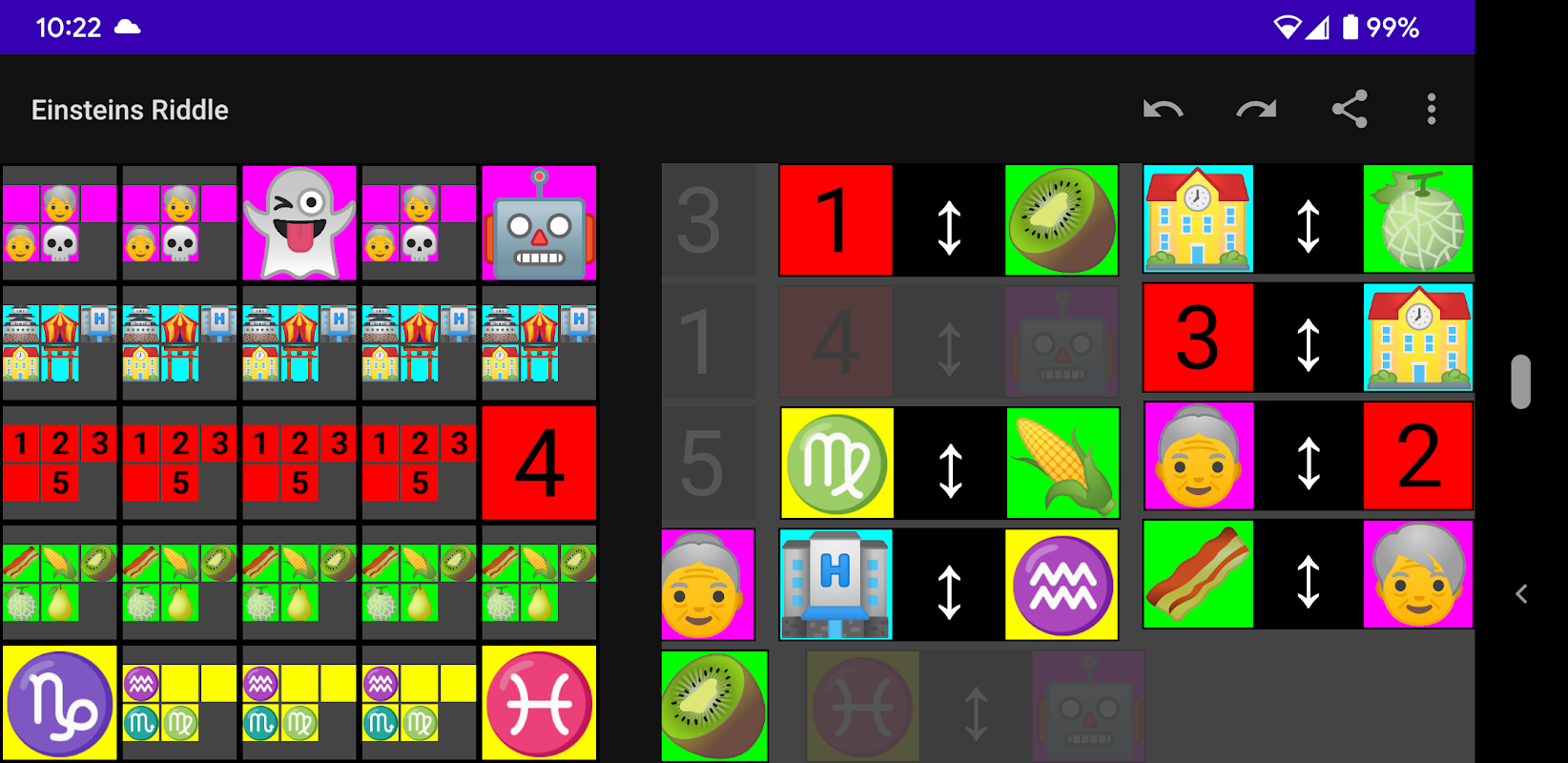演繹邏輯從一組前提開始,這些前提必須全部為真才能得出結論。通過排除不符合一條或多條線索的可能性,通常可以逐步得出結論。這可能需要集中註意力、記憶力和注意力來組織線索及其關係。您可以根據自己的喜好使遊戲變得簡單或困難。