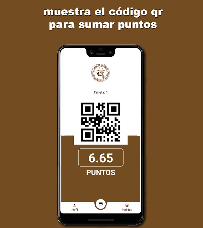 在我們的應用程序中註冊並在每次在El Criollo Coffee購物時顯示QR碼,您將累積積分,當您達到100積分時,您可以扣除5歐元的購買費用。