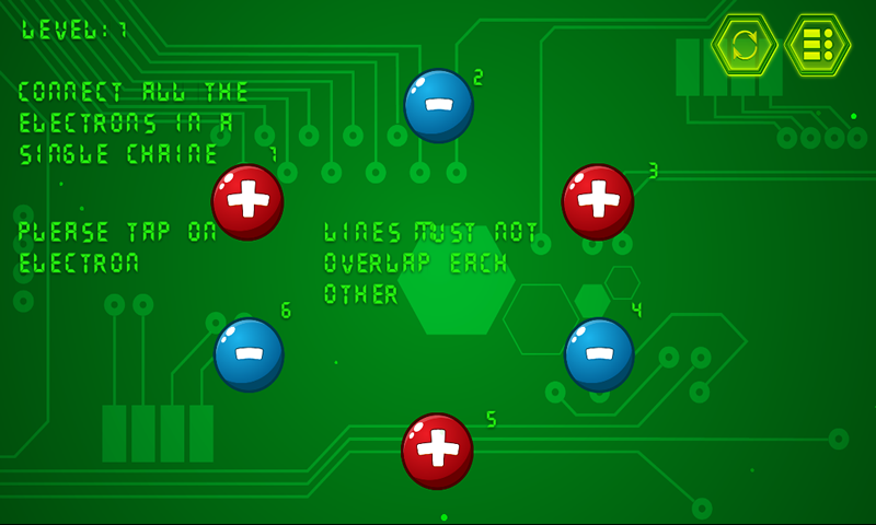 Semplice gioco di intelligenza. Devi unire gli elettroni positivi e negativi creando un circuito elettrico chiuso evitando di far passare la linea della corrente elettrica su altre linee presenti.