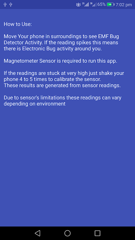 App is also a metal detector because metals have their magnetic field and the app will tell you if it encounters a metallic object. If you are trying to detect a camera then make sure there is no metallic object in the surroundings as it will distort the readings. It acts as Hidden Camera Detector and locator with its bug detector feature.
