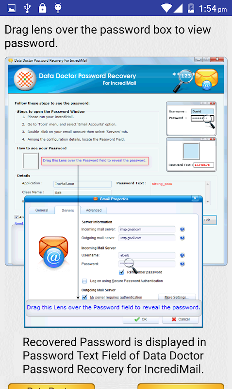 該應用程序建議密碼揭露和顯示步驟轉換隱藏使用各自的數據醫生密碼恢復軟件適用於Windows星號或點背後的密碼。數據醫生密碼恢復軟件揭示保存的所有類型的所有類型的所有類型的網站的電子郵件配置電子郵件的密碼,以及流行的電子郵件服務,例如Gmail Hotmail的前景雅虎AOL等在SSL無論你已經配置POP3 SMTP或基於IMAP的設置TSL或標準的身份驗證設置。