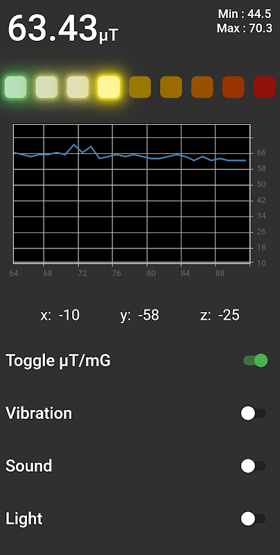 此應用程序使用設備內的內置磁傳感器(指南針)。並通過一排彩色 LED 顯示實時讀數,讓您清楚地了解 EMF 水平。您可以使用切換按鈕快速輕鬆地在米羅特斯拉 (uT) 和毫高斯 (mG) 測量單位之間切換。