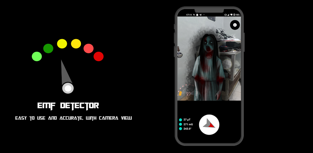 帶有真實幽靈狩獵工具(使用內置的Android Devices Magnetic Sensor的EMF Detector)的Ghost相機,用於檢測和通信。