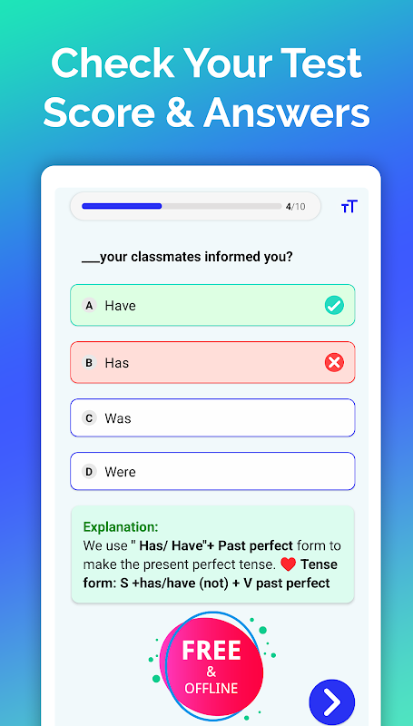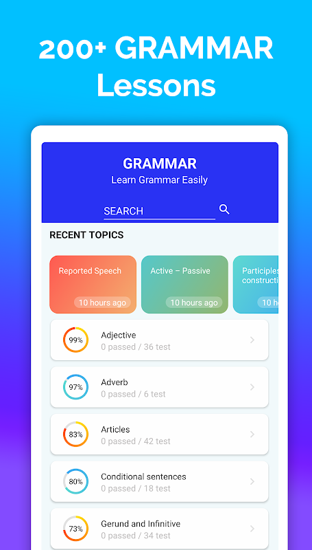 英語文法應用程式可幫助您輕鬆提高英語文法水平,為英語文法測驗做好準備,或快速提升您的寫作和口語水平。使用英語文法應用程序,您可以免費學習 300 節文法課程和 20,000 道測驗題(其中 10,000 道帶有講解)。最重要的是,下載我們的應用程式後,您可以隨時隨地使用這些功能。