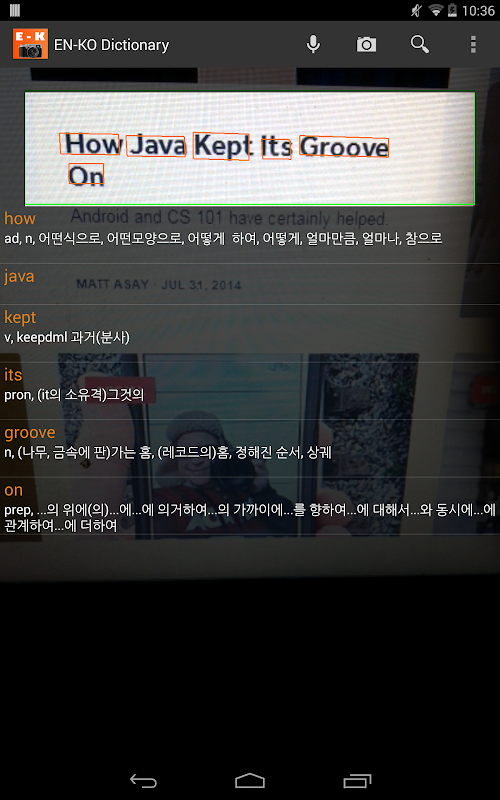 + no need to input text or capture text. It will recognize text and pharse automatically and translate english to korean.