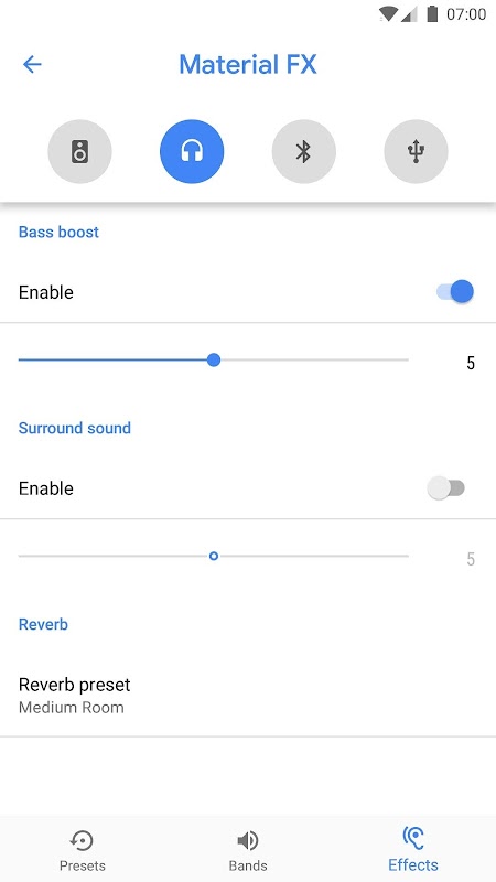 Bass boost, virtualization, reverberation and equalizer effects are all implemented.