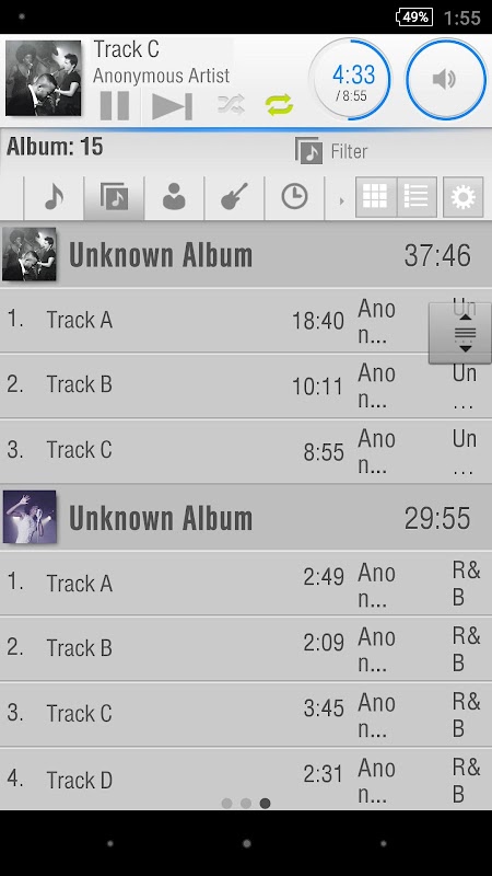 所有用於按鍵操作,播放列表,資料庫等的屏幕都安排得易於查看,即使不熟悉該應用程序的用戶也可以直觀,無故障地進行操作。