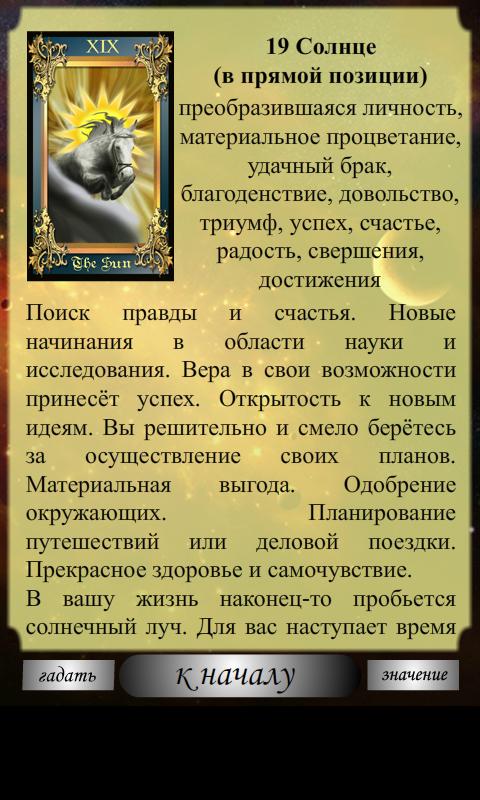 Гадание на картах таро и толкование (значение) карт таро. Удобная и практичная программа для тех кто любит гадать на картах таро. Программа для гадание поможет прояснить ситуацию в любой момент вашей жизни. Если вам удобнее гадать на своих собственных картах, то будет очень удобно иметь под рукой наше приложение с толкованием карт.