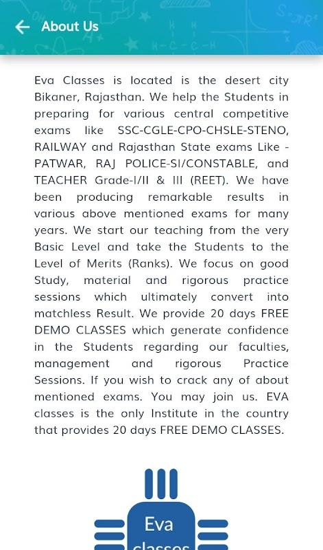 Eva Classes is located is the desert city Bikaner, Rajasthan. We help the Students in preparing for various central competitive exams like SSC-CGLE-CPO-CHSLE-STENO, RAILWAY and Rajasthan State exams Like - PATWAR, RAJ POLICE-SI/CONSTABLE, and TEACHER Grade-I/II & III (REET). We have been producing remarkable results in various above mentioned exams for many years. We start our teaching from the very Basic Level and take the Students to the Level of Merits (Ranks). We focus on good Study, material and rigorous practice sessions which ultimately convert into matchless Result. We provide 20 days FREE DEMO CLASSES which generate confidence in the Students regarding our faculties, management and rigorous Practice Sessions. If you wish to crack any of about mentioned exams. You may join us. EVA classes is the only Institute in the country that provides 20 days FREE DEMO CLASSES