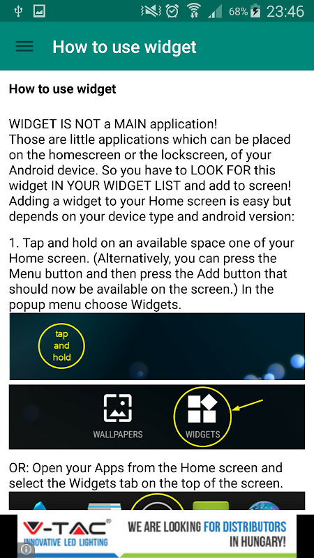 - 如果您不知道什麼是小部件並且無法將其添加到您的主螢幕!這不是錯!請觀看範例影片並閱讀如何使用說明!