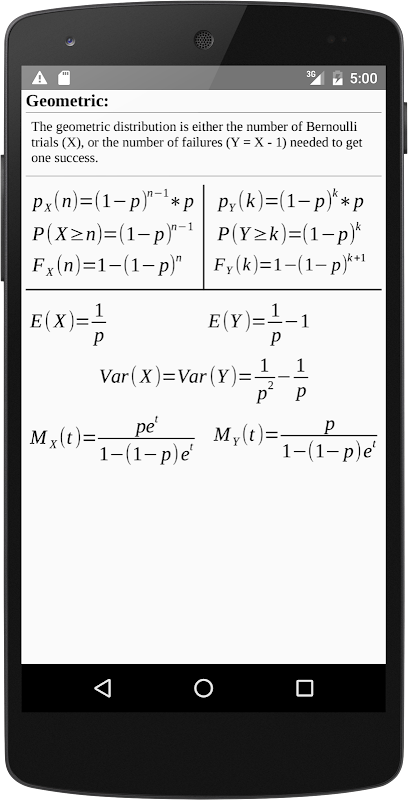 Compiled here is the most vital information on each of those distributions, Keep this app on your telephone screen while working practice problems to simplify the process of finding the formulas for the expected value, variance, and where applicable pdf, pmf, cdf and moment generating function. Each distribution has a short description of it's use.