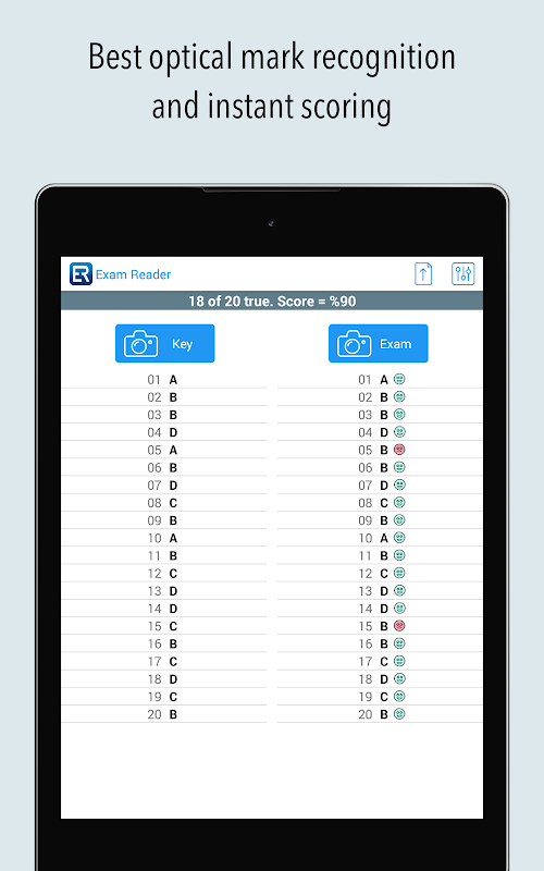 使用手機或平板電腦的相機作為評分掃描儀,對多項選擇測試,測驗和評估文件進行評分。它還可以讀取覆蓋的標記。