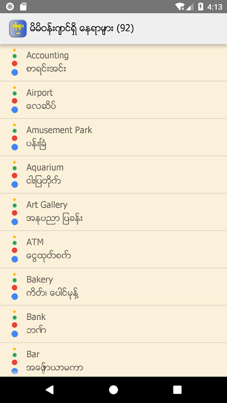 緊急電話號碼,例如高速公路上的警察局號碼;內比都仰光分部曼德勒分部實皆地區的警察局電話號碼可以在 Facebook 頁面上找到並集成到應用程序中。
