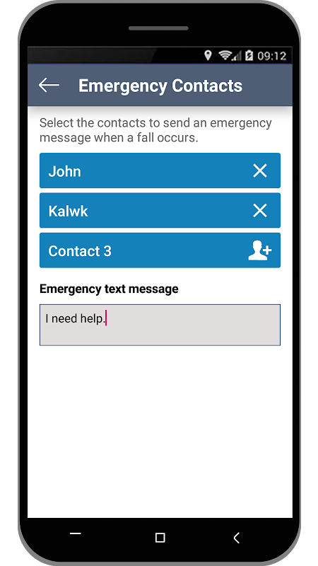• Send an alert message to selected contacts after a fall is detected. An emergency message will report the date, time, and place where the incident occurred.