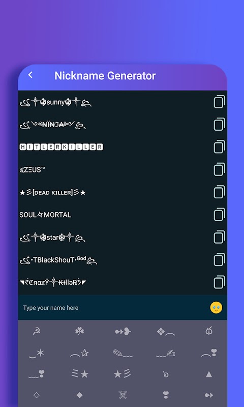 你是遊戲迷嗎?你想為你的遊戲取個獨特的暱稱嗎?如何設計您的名字或暱稱?!喜歡造型?!有了這個很酷的暱稱生成器應用程序,您可以將您的名字更改為帶有時尚字體和最佳字體的酷炫時尚名稱。這個免費的名稱生成器有助於解決遊戲玩家經常面臨的“暱稱已被佔用”的問題,您可以使用這個遊戲暱稱查找器並用充滿時尚字體和精美藝術的名字來炫耀您的名字,或者只是用精美的文字自定義您的個人簡介。