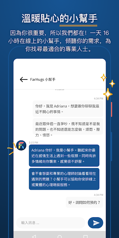 嘿,想找人說話時,記得我們都在!不受限於時間與距離,在家即可與專業人士談話,最快當日預約,取得最即時的幫助。現在就下載 FarHugs,開啟你的全心旅程。