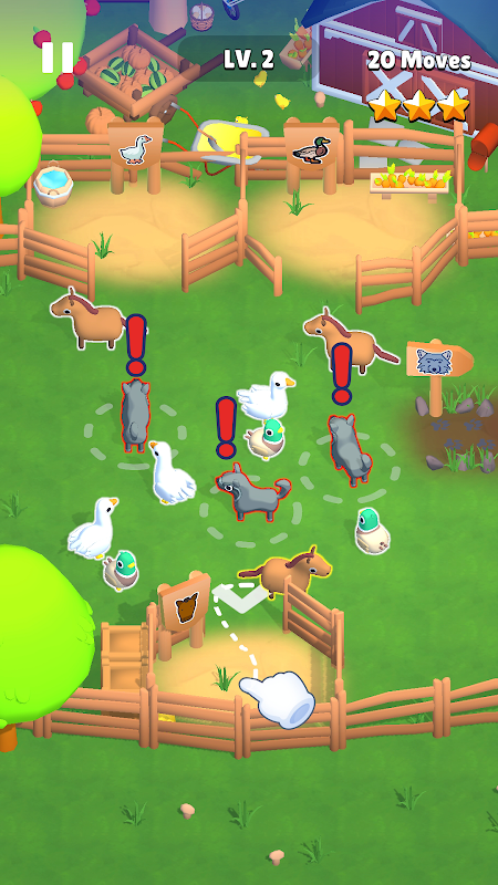 遊戲的每個關卡都是一個精心製作的農場場景,充滿了牛、羊、雞和馬等動物,每隻動物都在田野、穀倉和各種農場建築中迷失和困惑。玩家的任務是製定一條路徑,將這些動物帶回正確的圍欄。然而,任務並不像看起來那麼簡單。農場也是狼和狐狸等狡猾的掠食者的家園,它們潛伏著,隨時準備撲向任何遇到的毫無戒心的農場動物。