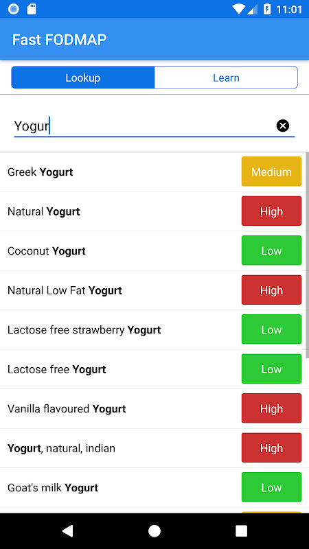 查找功能的重點只是速度和準確性。兩件事情最要緊當你試圖遵循低FODMAP生活方式。一旦應用程序啟動,你可以開始打字和看到的結果,當您鍵入(一個成語叫做增量搜索)。仰望食品項目不應該是一個痛苦,它應該是快速而輕鬆。