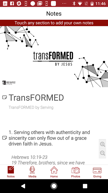 - 我們在週日早上的服務就在應用程序做筆記。在“注意事項”一節中的注意事項更新每個星期天,包括為這一天的筆記,這樣你就可以跟著,並添加自己的筆記。你可以做筆記上的任何註釋或詩句,然後保存或通過電子郵件發送的音符時,你就大功告成了。